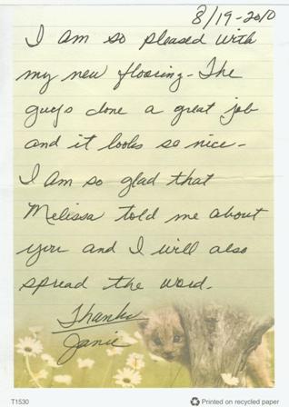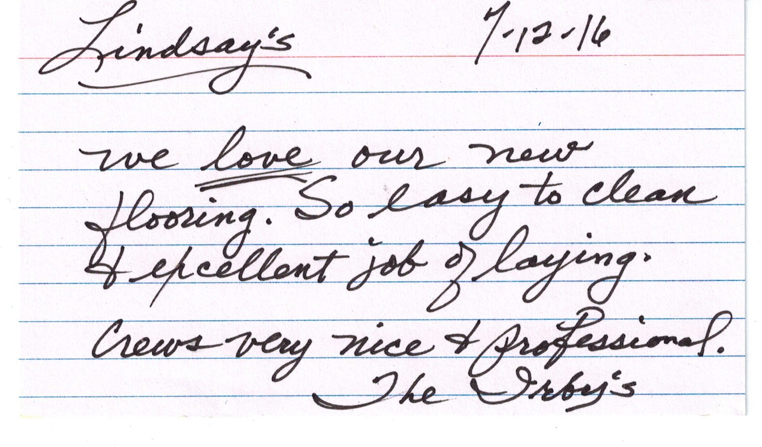 WE WANTED TO WRITE A NOTE TO THAN YOU -ALL FOR THE WONDERFUL JOB YOU DID ON REMOVING AND INSTALLING OUR FLOORS.