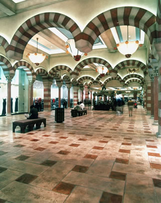 | Straight out of Arabian Nights, Desert Passage is a spectacular display of creativity and design. THis shopping area is located inside of the Aladdin Casino in Las Vegas. Cream Beige COLOR HARDENER forms the base. DECORATIVE SANDBLAST STENCILS are used to etch messages in the concrete. The floors were then colored to match the arched colums that form the center courtyard and passage areas. |