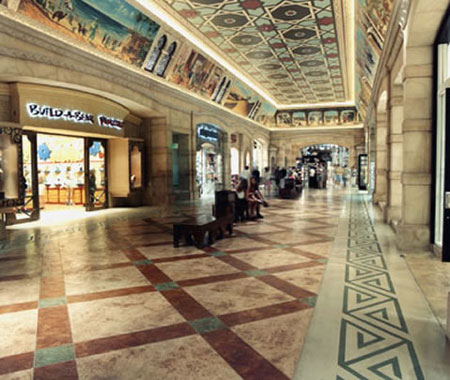 | Straight out of Arabian Nights, Desert Passage is a spectacular display of creativity and design. THis shopping area is located inside of the Aladdin Casino in Las Vegas. Cream Beige COLOR HARDENER forms the base. DECORATIVE SANDBLAST STENCILS are used to etch messages in the concrete. The floors were then colored to match the arched colums that form the center courtyard and passage areas. |